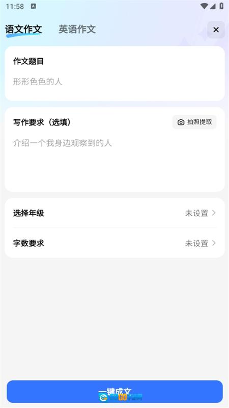 5、也能够点击语文作文板块,输入作文题目、选择对应年级和目标字数后,点击“一键成文”按钮即可生成。