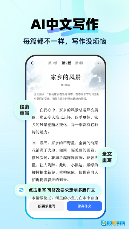 1、具备作文写作辅助功能,用户选择写作服务后,AI智能技术会协助指导其开展作文创作。