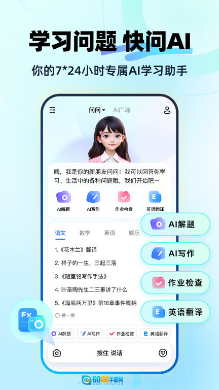 快问AI,也被称作快问ai智能答疑,作为搭载最新人工智能模型的中文学习助手,可助力学习者应对学习过程中的各类难题,涵盖科学、历史、地理、运动等诸多领域。它不仅能开展智能对话与心理辅导,还能协助解决学术方面的问题,以满足多样化的学习需求。