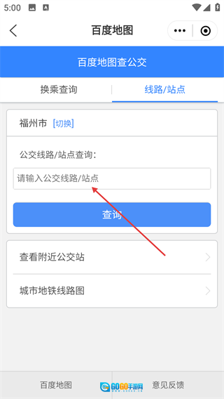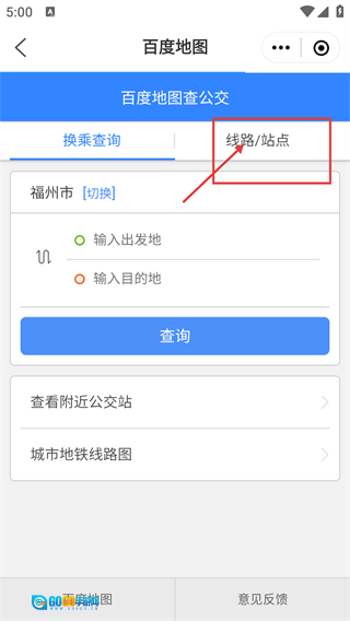 3、打开百度地图的公交查询页面,点击【线路/站点】标签,把默认显示的换乘查询界面切换成公交线路/站点的查询界面。