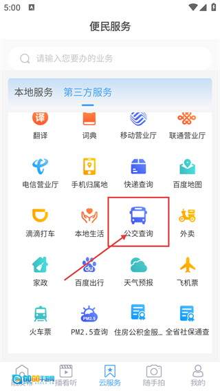 2、进入云服务的便民服务页面后,切换到【第三方服务】标签页,再点击【公交查询】选项。