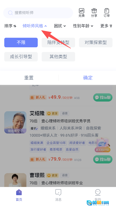 1、打开软件进入首页,筛选倾听师风格类别。
