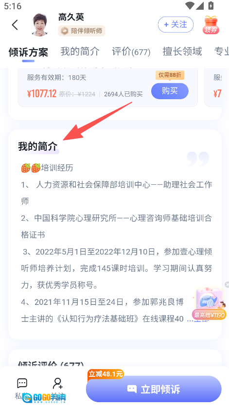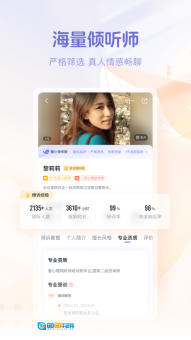 2、倾听师的专业背景信息详实完备,培训经历等相关内容均透明展示,有助于提升服务选择的可信度,同时也能让匹配更精准。