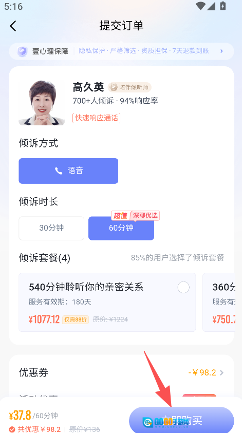 3、选择倾诉方式时长套餐,提交订单点击立即购买。