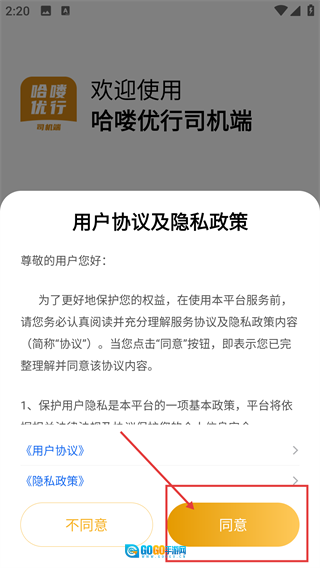 1、在【哈啰优行司机端】弹出的用户协议与隐私政策窗口里,点击【同意】按钮,就能确认相关协议并进入之后的流程。