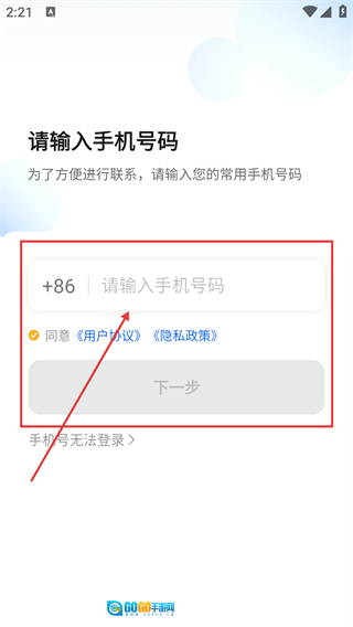 2、进入【请输入手机号码】页面后,填写你常用的手机号码,系统会自动勾选相关协议,完成这些操作后点击【下一步】按钮继续推进流程。