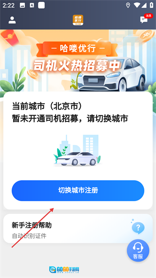 4、若当前城市尚未开通司机招募,点击【切换城市注册】按钮,即可选择已开通的城市来继续完成司机端的注册流程。