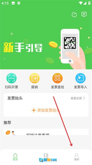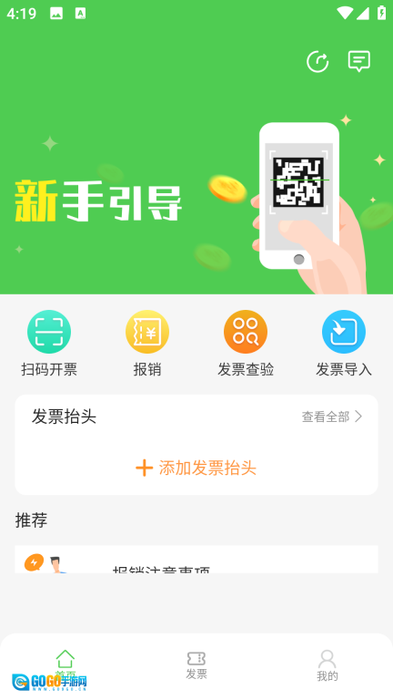 主界面支持【扫码开票】【报销】【发票查验】等功能操作,同时可添加发票抬头以管理开票信息。