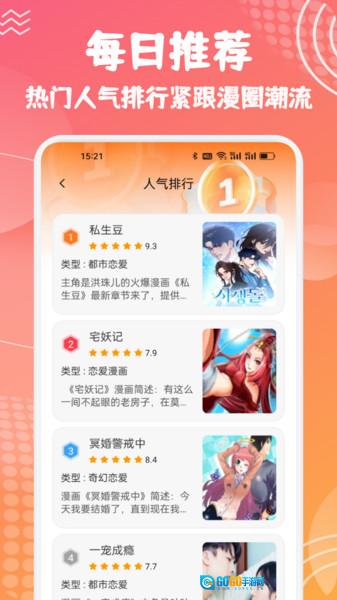 1、界面简洁美观:软件界面设计简洁大方,各类漫画分类清晰明了,能够让用户快速定位到自己喜爱的漫画作品。