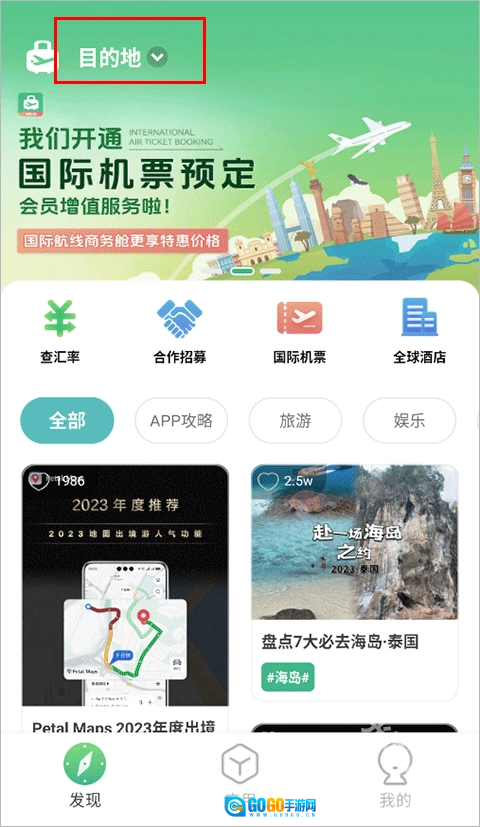 1、打开出境易,看到页面上能查看国际机票、酒店和旅游攻略,点击左上角的输入框填写目的地;