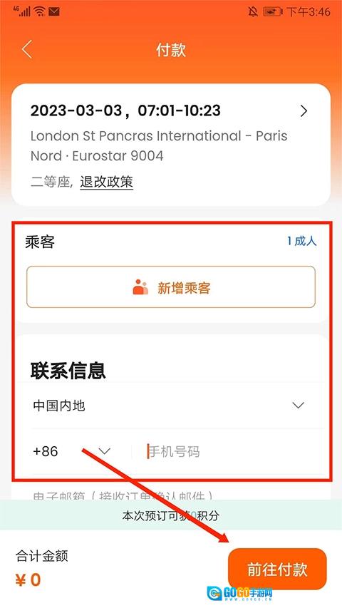 4、进入付款界面后,先填写完整“乘客信息”与“联系方式”,接着点击右下角的“前往付款”按钮,就能完成火车票的购买操作。