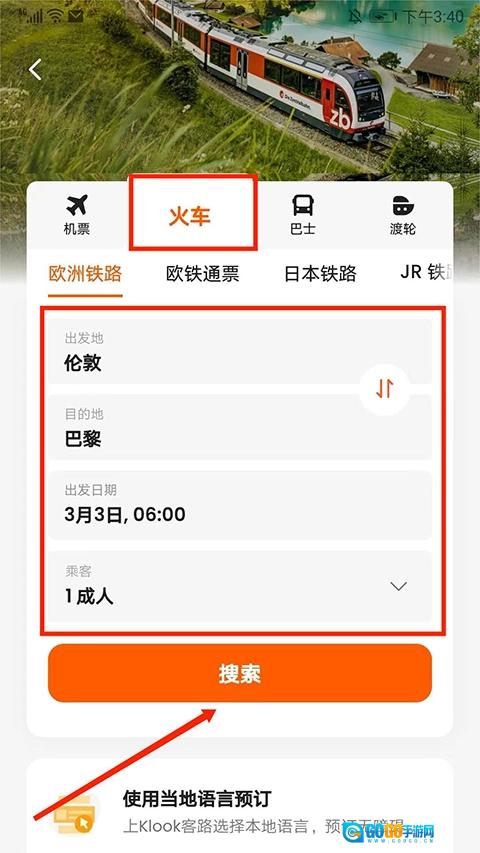 2、进入交通界面后,找到并选择“火车”栏目,依次填写“出发地”“目的地”“出发时间”和“乘客数”这些信息,完成后点击“搜索”选项。