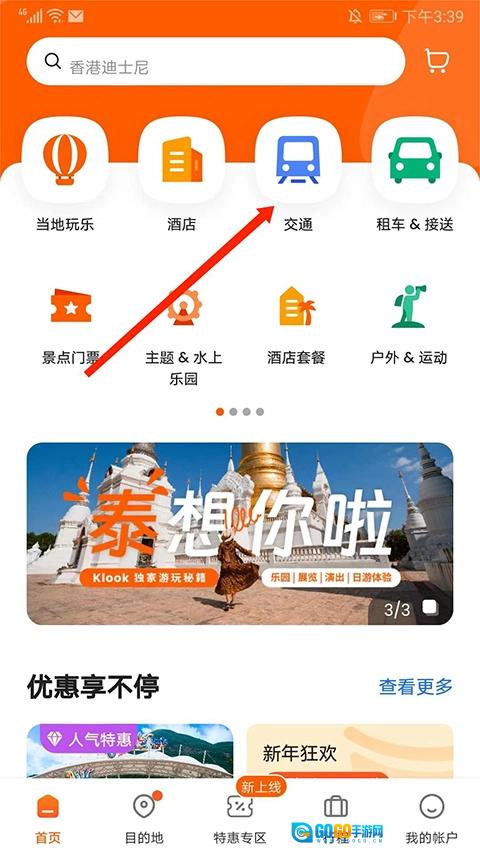 1、打开客路旅行,选择上方“交通”图标,
