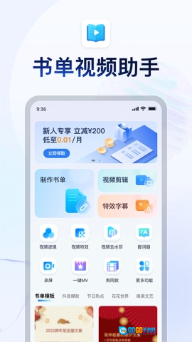 书单视频助手是一款集成了多种实用功能的创意视频制作工具。它可以把文字内容和背景音乐或者朗读配音融合在一起,通过视频的形式呈现出来,并且为用户提供了多样的书单模板供选择,还拥有视频编辑、图片编辑等实用功能,是视频创作过程中的得力助手。