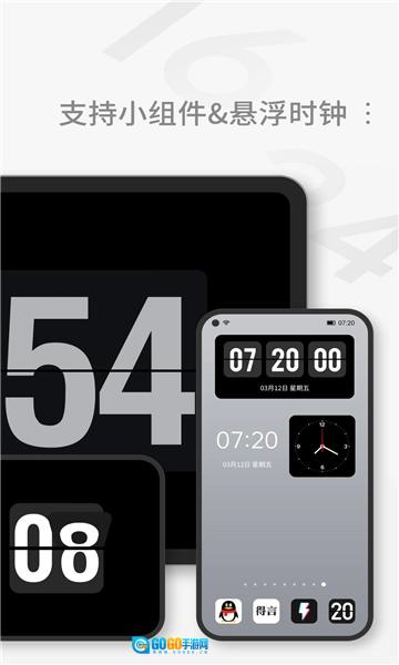 翻页全屏时钟、数字时钟、悬浮时钟、悬浮秒表、番茄钟、正计时、电子钟、整点报时、闹钟、白噪音、励志语录等功能。