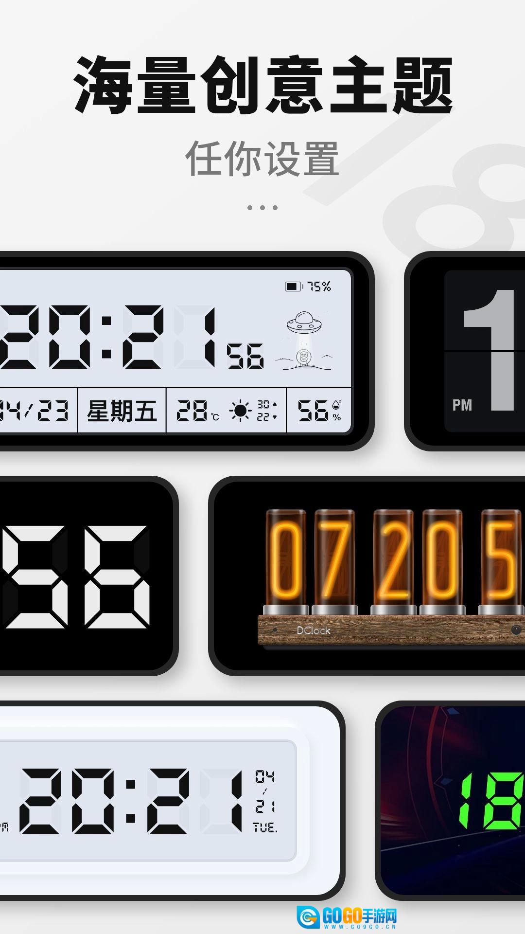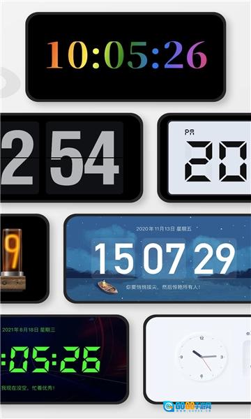 2、【风格多样的时钟皮肤】换上心仪的皮肤,是不是会更愿意打开App,满心期待地开启今日任务呢?科技、星空、自然、艺术、复古、四季、暗黑、清新等各类风格与分类的数字时钟及模拟时钟皮肤,正等待你的挑选。