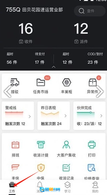 2.进入“工作”界面,查看当天的派件、收件任务。