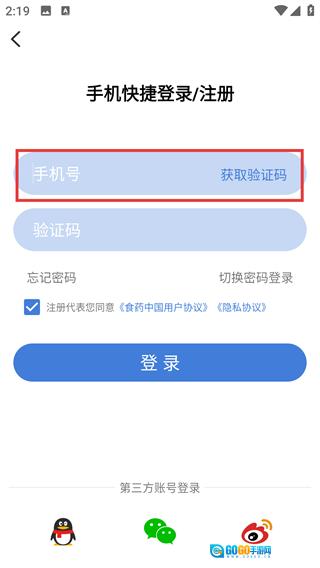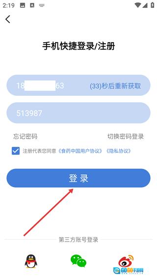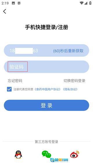 1、打开【食事药闻】应用,在启动页面找到并点击【登录/注册】按钮,即可进入手机快捷登录与注册的界面。