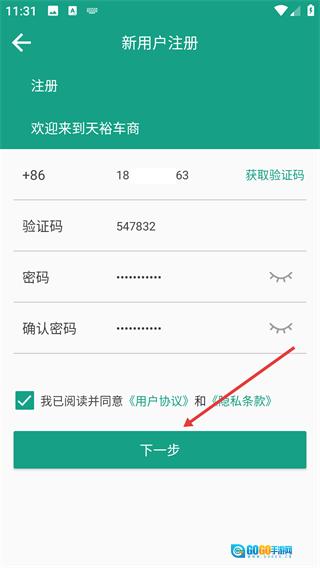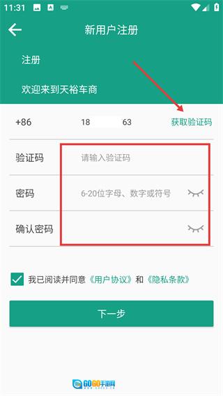 3、点击【获取验证码】按钮,输入收到的验证码,接着设置密码并再次确认密码,最后勾选同意相关协议。