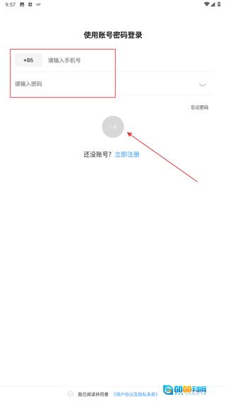 2、在账号密码登录页面,依次填写【请输入手机号】和【请输入密码】的内容,勾选相关协议后即可完成登录操作;若没有账号,点击【立即注册】按钮即可进行注册。