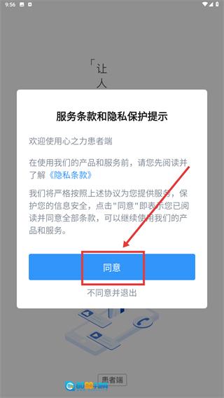 1、仔细阅读《服务条款和隐私保护提示》后,点击“同意”按钮,即可进入“心之力患者端”的后续操作流程。