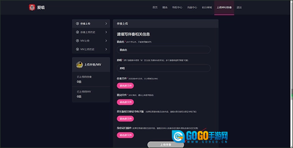3、接着填写好相关信息,上传好伴奏文件后,点击亮起的“上传伴奏”按钮即可。