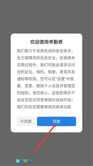 1、打开应用后,请先留意【欢迎使用考勤表】的提示内容。应用会借助【安全技术】来确保信息安全,后续可能会向您请求多项必要的权限。