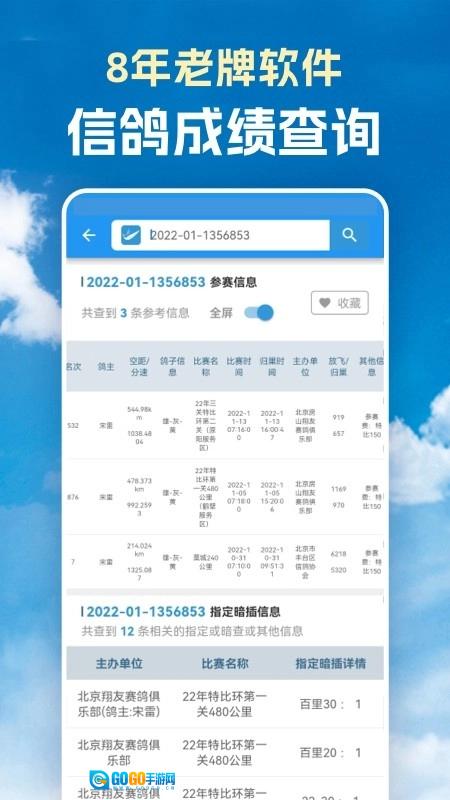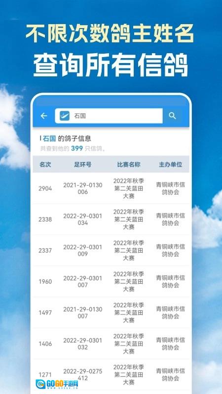 鸽主查询功能,可依据鸽主的参赛名字,无次数限制地查询其参赛信鸽的足环编号、比赛相关信息以及所属参赛单位。