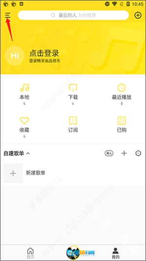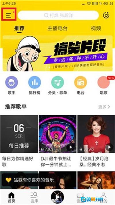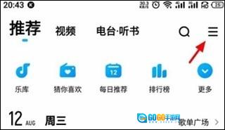 1.在酷我音乐推荐界面中点击左上角的【三】按钮。