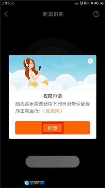 2.酷我音乐的听歌识曲功能需要获取麦克风权限,请点击【确定】。