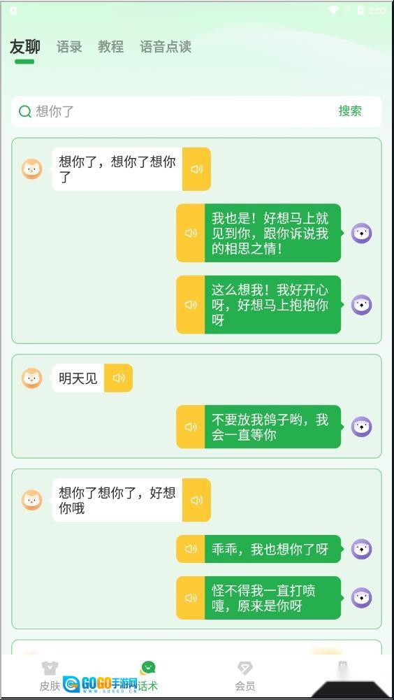 4、点击“话术”选项,这里提供了聊天技巧指导、使用教程说明以及语音点读等功能。
