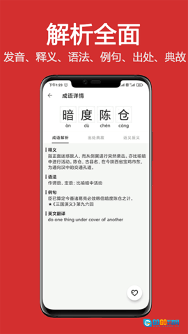 专为成语爱好者打造的《成语词典大全》是一款实用的词典工具,它收录了多达56000条成语,每条成语都配有详尽的注解,涵盖拼音、释义、语法、例句、出处、典故、英文翻译、近义词及反义词等内容。借助这款软件,用户能够学习各类常见成语,从而更深入地理解并灵活运用成语。