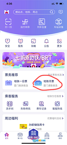 4、在首页的中间部位点击“地铁月票”选项。