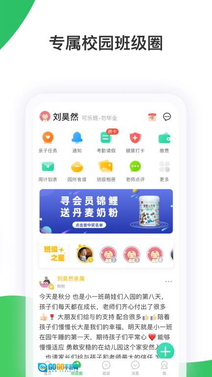 班级动态、幼儿园、考勤请假、班级相册、表现点评等家园互动功能全部具备,涵盖家园联系的各个场景,便于家长全方位知晓宝宝在园的生活状况。
