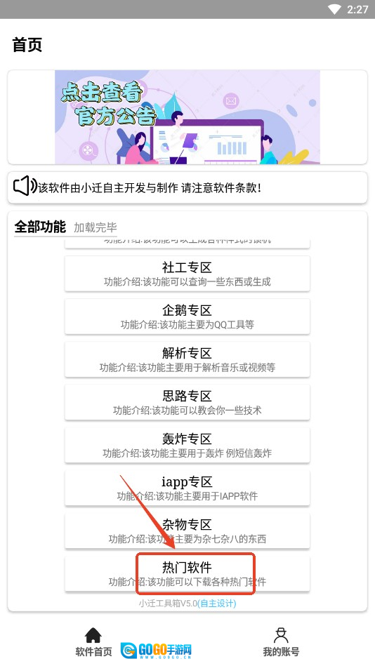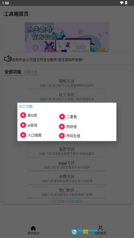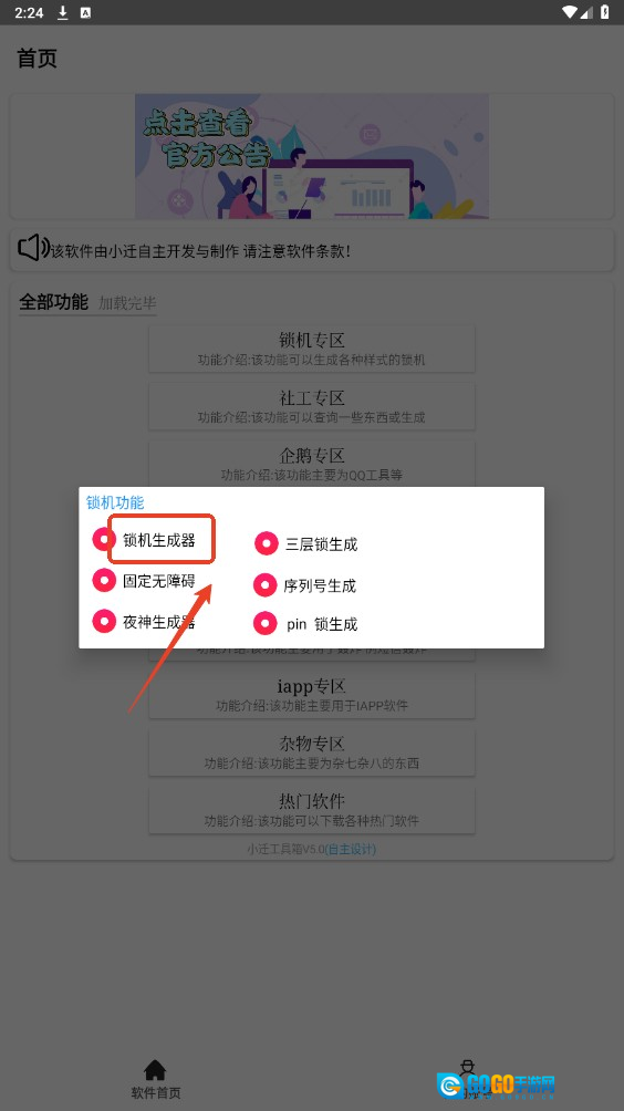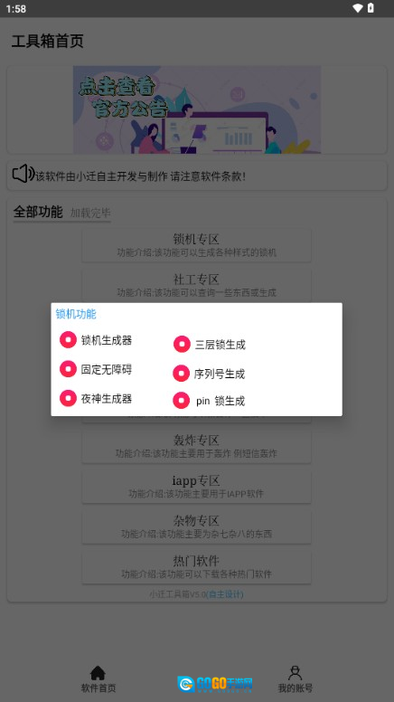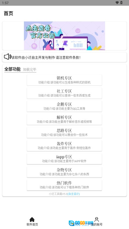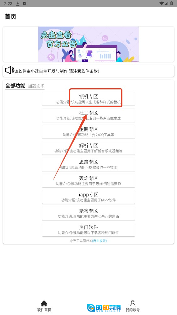 按照前面提到的步骤完成小迁工具箱的注册与登录操作,进入到应用首页后,找到并点击你需要使用的功能板块,像锁机专区这类功能就可以直接选择。