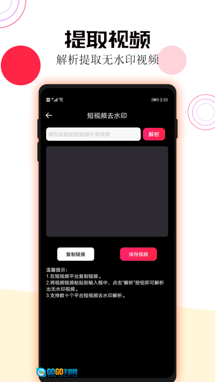短视频一键去水印是一款功能实用且强大的去水印应用。在当下短视频风靡的时代,大家经常会碰到想保存或二次创作喜欢的短视频,却被水印困扰的情况。这款应用的诞生,恰好解决了这个问题。借助它,用户可以完全按照自己的实际需求,简单又准确地消除视频里的水印。不管是想得到无水印的高清素材用于个人观看,还是便于后续对视频进行二次修改、创作,它都能帮您一把,让您用更快、更好的方式获取到想要的短视频内容。要是您正好有这方面的需求,现在就别再迟疑,赶紧来试试吧!
