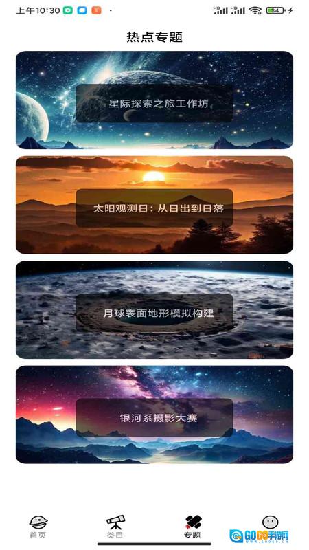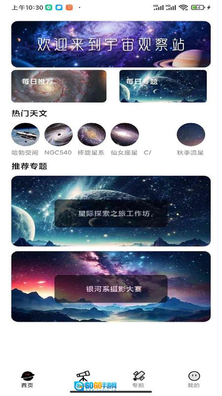 1、首页涵盖冥王星环、v404CY、棒旋星系、47附近、爱喜彗星及冬季长星等类别,同时设有各类推荐专题。
