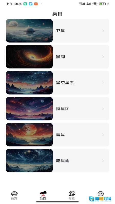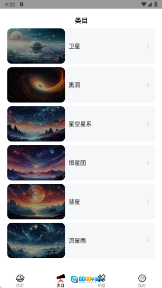 3、在类目页面中,你能够获取有关卫星、黑洞、星空星系、恒星团、彗星以及流星雨等方面的知识;