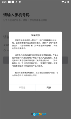 1、软件安装完成后打开,会弹出是否同意的提示,点击同意即可进入注册界面;