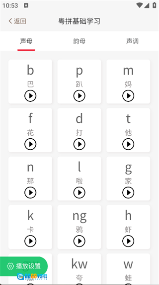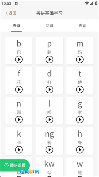 点击首页的粤语拼音选项,就能查看详细的粤语拼音基础学习功能。