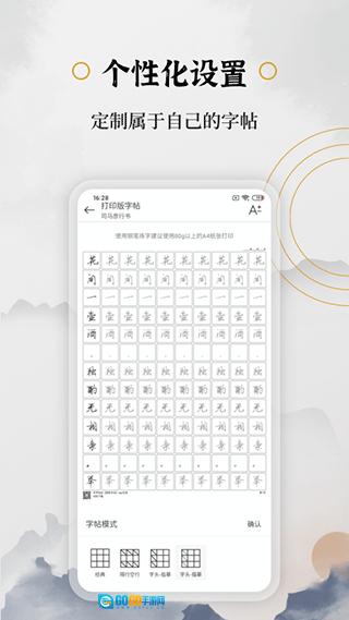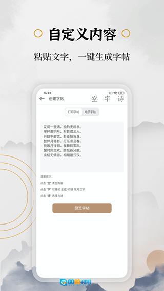 用户可以输入古诗、名言或个人随笔等文字内容,生成对应字体的练字稿;也能选用软件的经典书法素材,既能满足个性化练字需求,又能增添练习的趣味性。