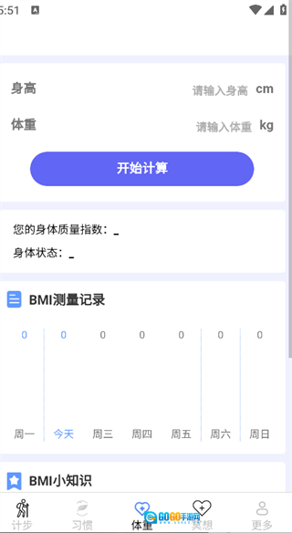 3. 点击页面下方的“体重”选项,输入身高与体重的数值,就能快速计算出BMI。
