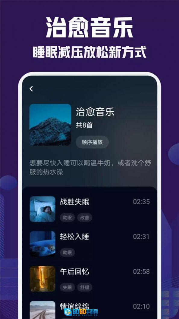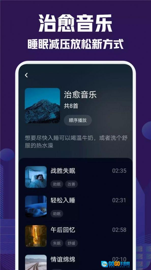 1、这是一款专业的助眠音乐软件,能让大家通过聆听轻音乐快速进入梦乡,舒缓身心、放松精神。