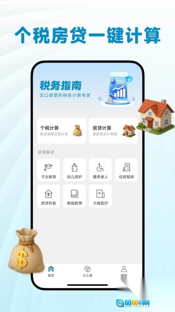 首页设有个税计算、房贷计算功能,同时提供丰富的政策解读内容。