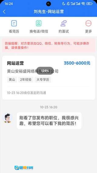1、为求职者和企业搭建即时沟通渠道,同时配备防骗提醒功能以保障沟通安全,让双方交流更高效。