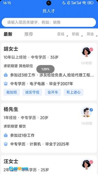 2、在人才搜索界面,能够看到最新更新的人才信息,并且可以全面详细地了解这些人才的相关情况。