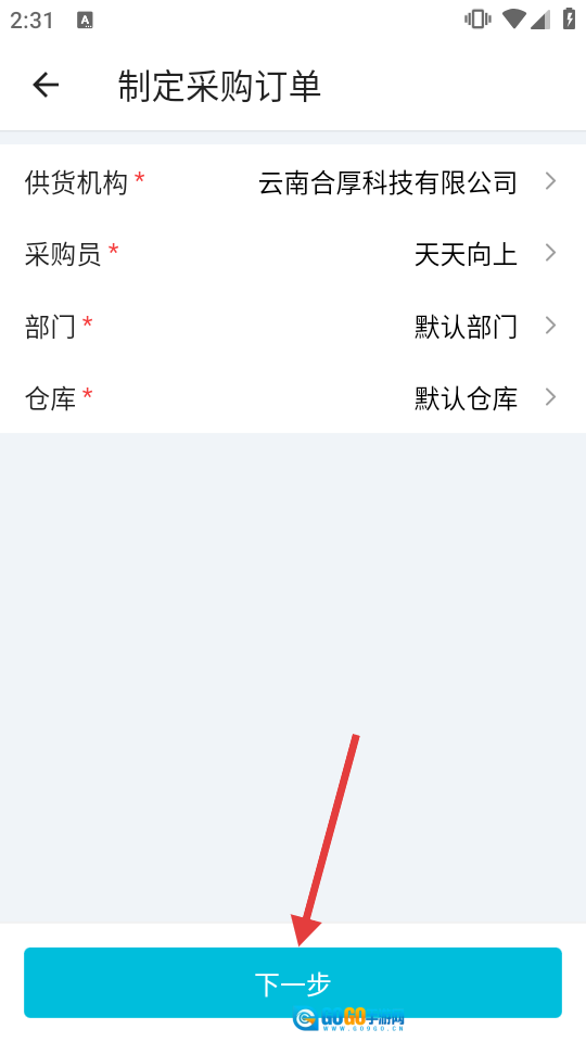 3、在采购订单制定页面,确认供货机构、采购员等相关信息后,点击【下一步】按钮,即可进入订单确认页面。
