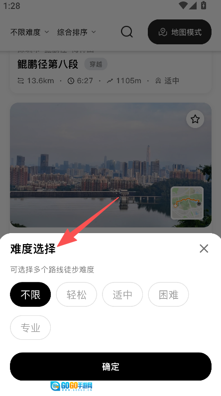 1、打开路游,选择徒步路线的难度等级并点击确定。