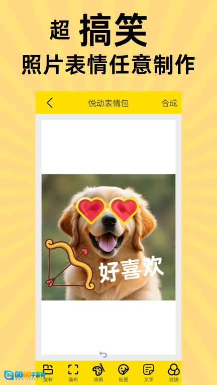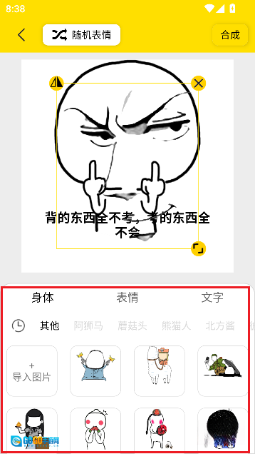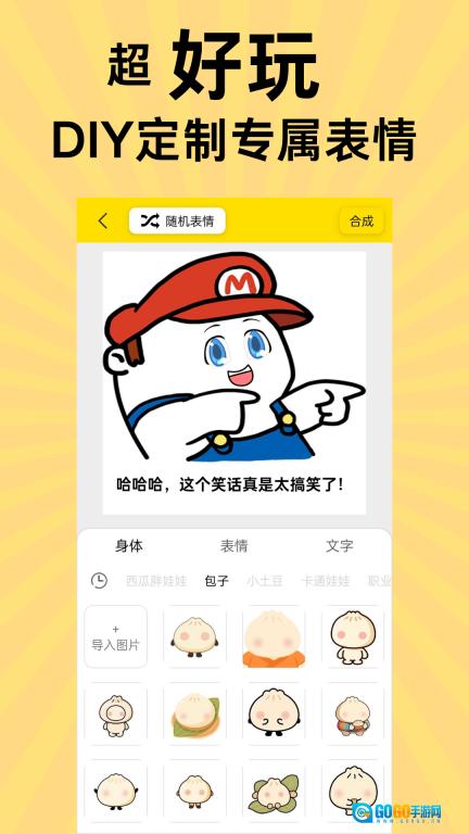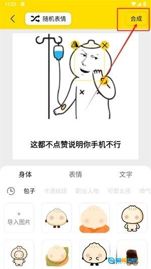 3、这款应用专门设置了个性化DIY功能,用户能够自由搭配各类表情元素,编辑好之后,只需点击界面右上角的【合成】按钮,就能制作出专属于自己的表情。