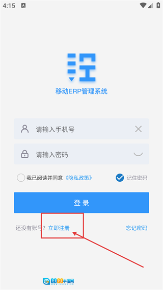 2、进入【移动ERP管理系统】的登录页面,要是还没有账号,点击【立即注册】这个选项,就能进入平台的账号注册流程了。